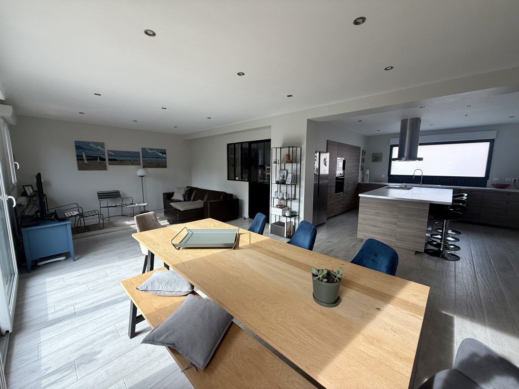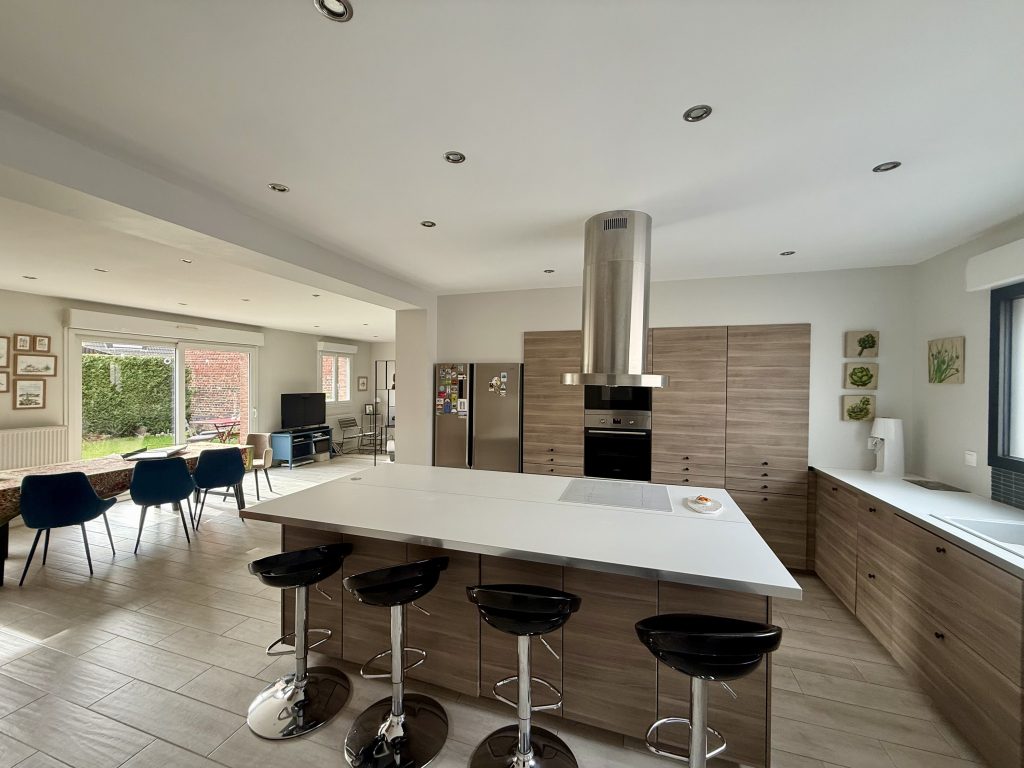 La cuisine, contemporaine et parfaitement équipée, dispose de nombreux rangements et d’un îlot central, véritable espace de convivialité pour partager de précieux moments en famille ou entre amis. Un cellier attenant accueille une chaudière gaz récente ainsi qu’un espace de stockage pratique.