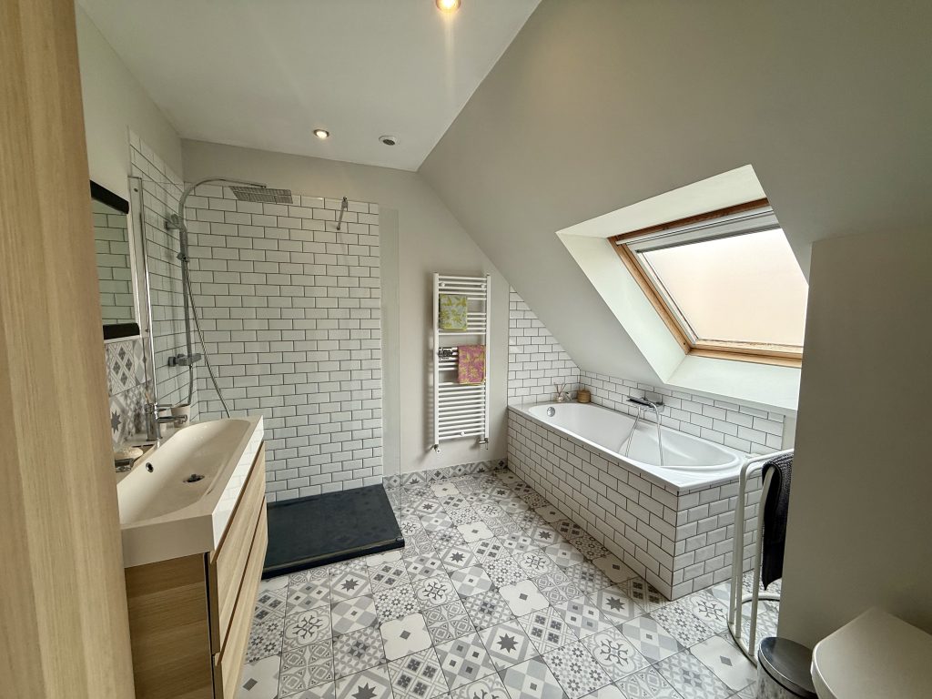 À l’étage, vous découvrirez trois belles chambres ainsi qu’une vaste salle de bains équipée d’une douche et d’une baignoire, complétée par un second WC.