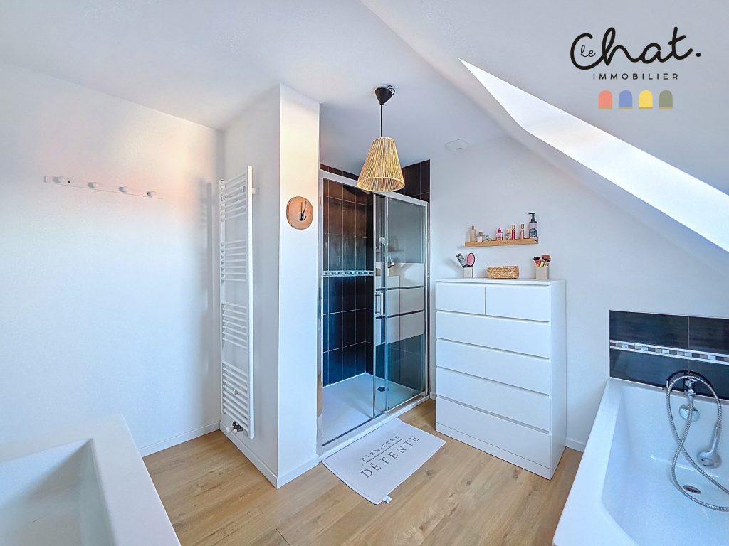 A l’étage, couloir desservant 3 chambres, second wc, et une salle de bain familiale avec douche à l’italienne et baignoire.