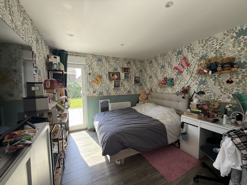 À l’étage, trois chambres supplémentaires ont été créées, accompagnées d’une salle de bains, offrant un espace idéal pour une grande famille, des adolescents ou un espace bureau.